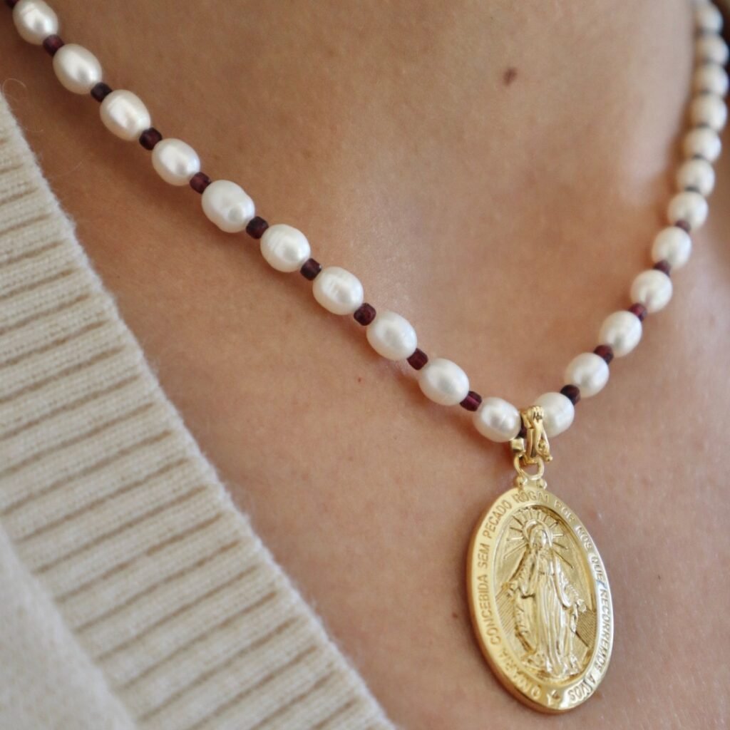 O Colar de Pérolas e Granadas com Medalha Milagrosa de N. Sra. das Graças em prata 925 com banho de ouro 18k combina perfeitamente com a pulseira escapulário da mesma linha e acabamento. O trabalho artesanal traz refinamento enquanto honra a devoção com discrição e elegância atemporal.