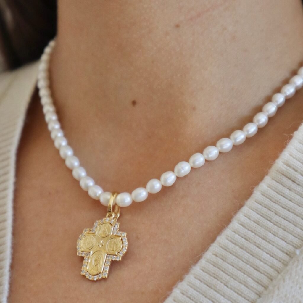 A cruz, em suas múltiplas interpretações, permanece como o símbolo central do cristianismo. Em nossa coleção, você encontrará o Brinco Cruz, Anel Terço e Colar de Pérolas 7mm com Pingente Cruz Cravejado com Cristais em prata 925 com banho de ouro 18k, todos executados com o mesmo compromisso de qualidade e significado.