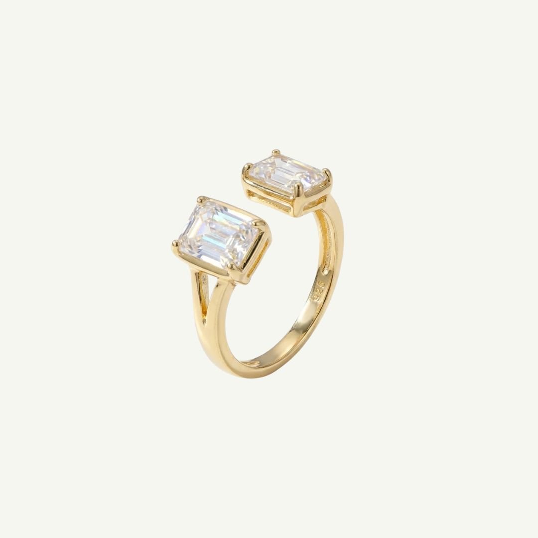Este anel de design aberto apresenta duas Moissanitas em lapidação esmeralda, criando um visual geométrico e imponente. Uma joia contemporânea que une a delicadeza do aro com a força das pedras retangulares.