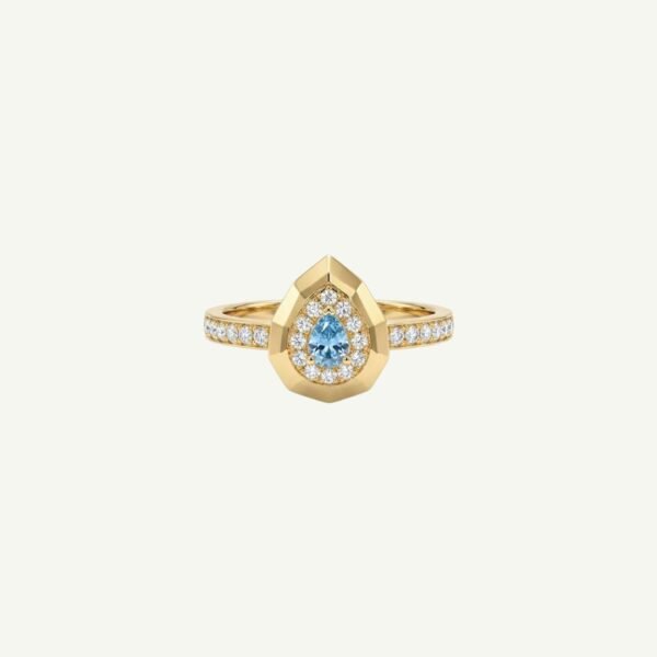 Anel Gota Topázios Azul e Brancos. Uma peça de acabamento refinado, produzida em prata com banho espesso de ouro 18k. O design apresenta uma pedra central de Topázio Azul lapidada em gota, cercada por cristais cravejados que se estendem pelo aro, conferindo sofisticação e modernidade à joia.
