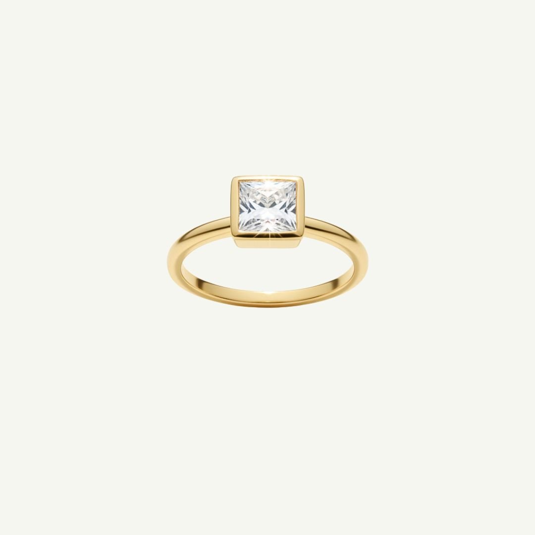 A estrela deste anel é a moissanite quadrada, conhecida por seu brilho inigualável. A moldura lisa em dourado realça ainda mais a luz da pedra, criando uma joia clássica e deslumbrante para usar todos os dias.