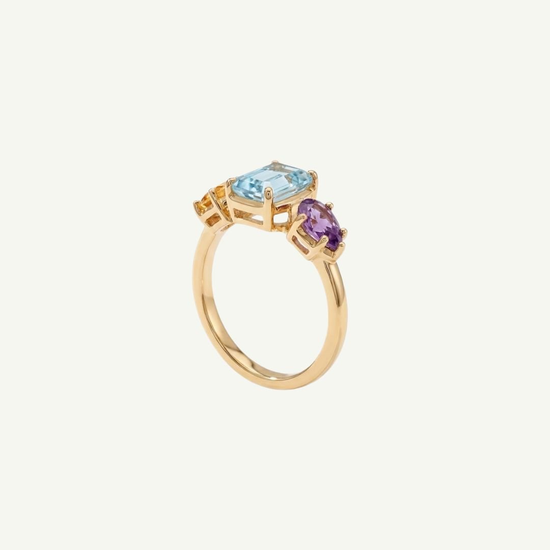 Unindo a serenidade do azul, a energia do amarelo e o mistério do roxo, este anel é a escolha perfeita para adicionar um toque de cor com elegância ao seu look.