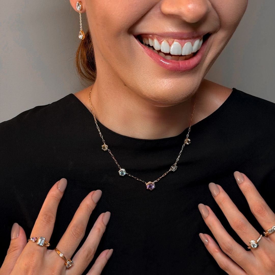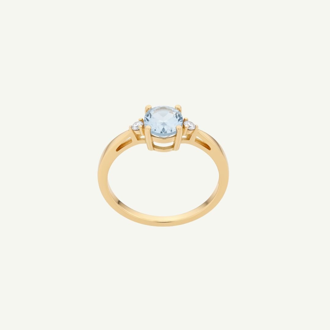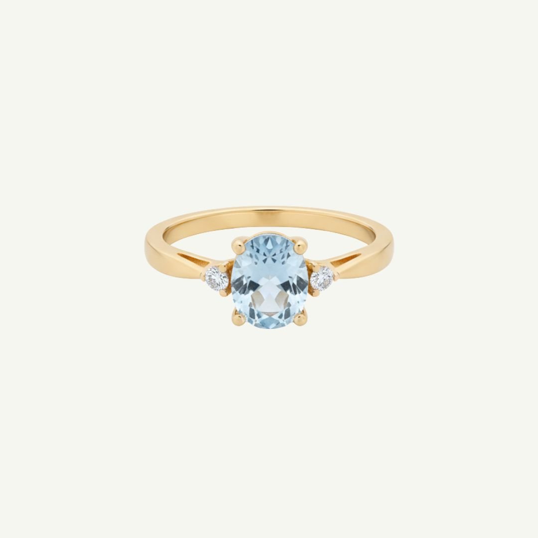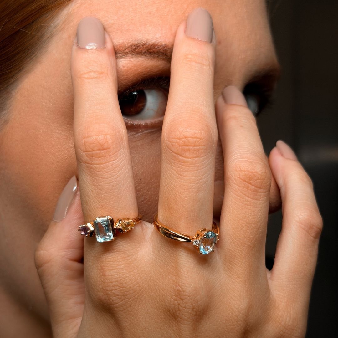 Nosso anel tríade de topázios com topázio azul oval e topázios brancos laterais cravejados. O tom suave da gema ilumina as mãos e combina perfeitamente tanto com looks de dia quanto de noite.