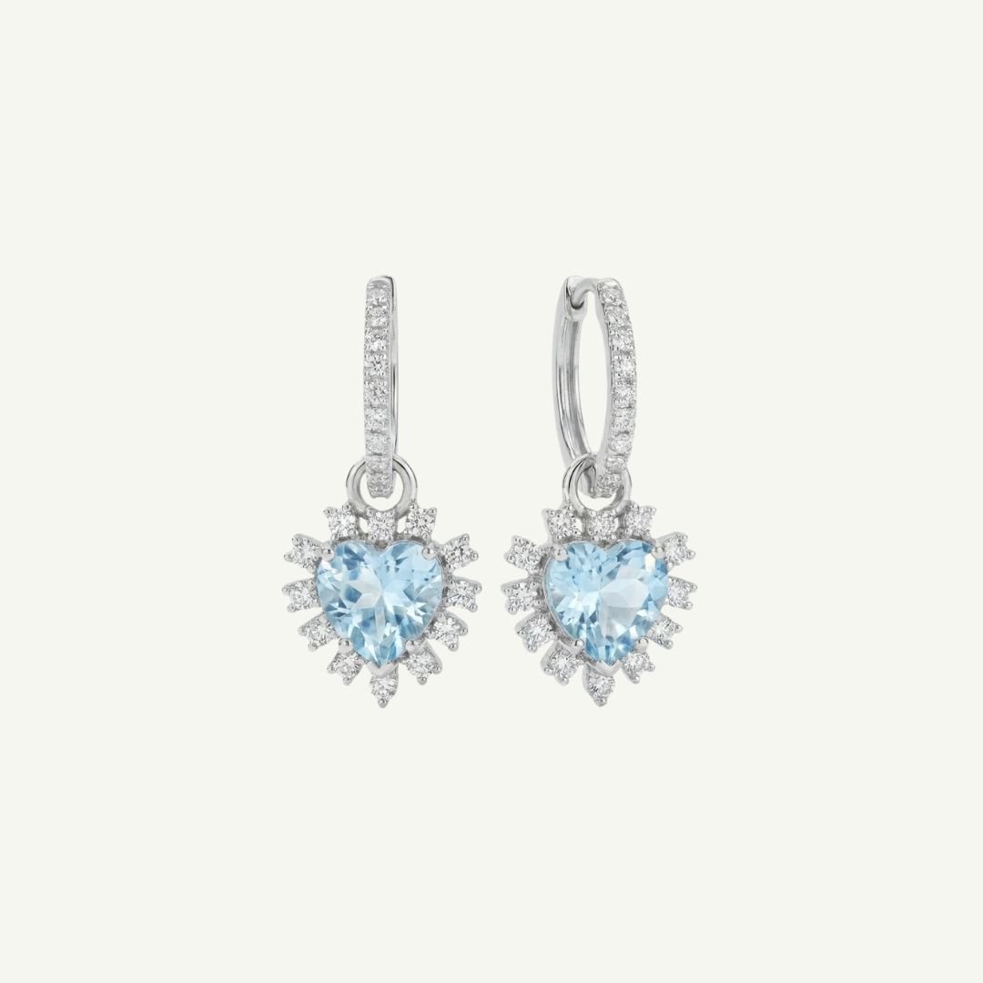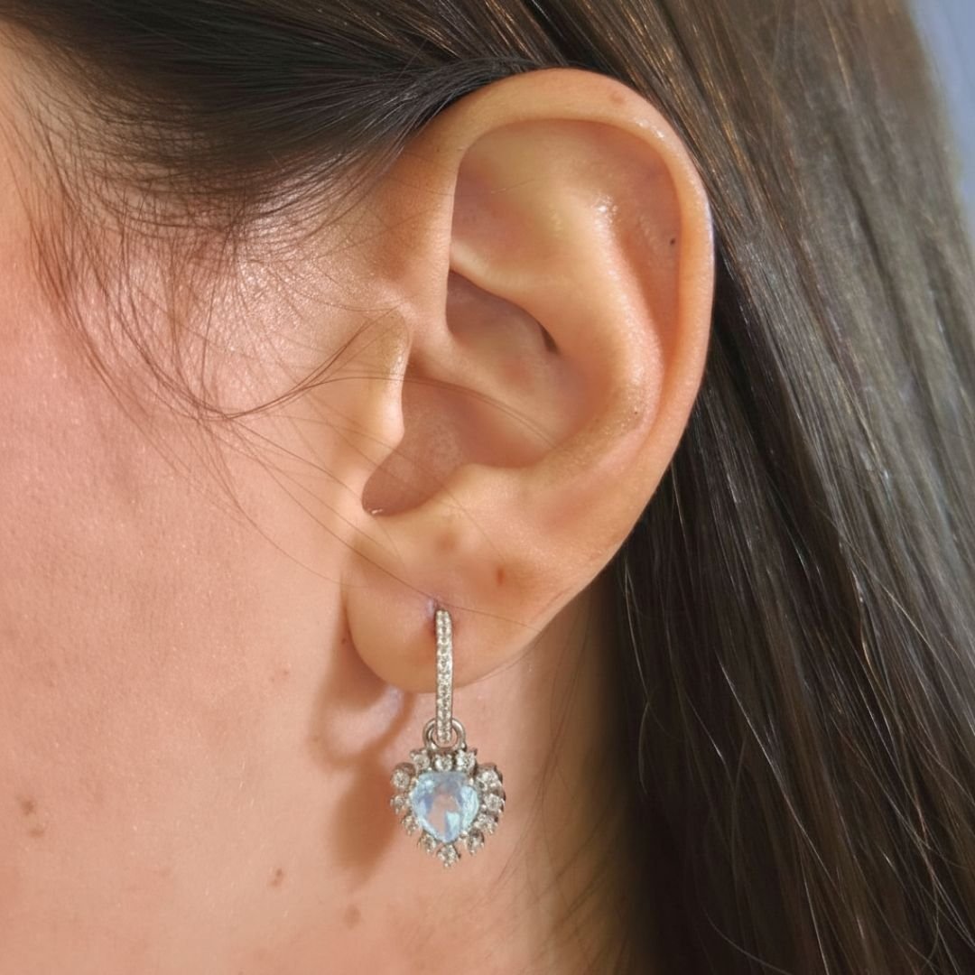 Encante-se com a delicadeza e a versatilidade da Argola Coração de Topázios. Este brinco apresenta uma argola cravejada que sustenta um deslumbrante pingente de coração em Topázio Azul, cercado por um halo de Topázios Brancos.