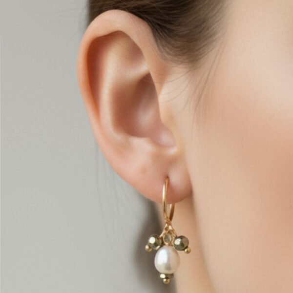 Pequenas argolas em prata 925 com banho espesso de ouro 18k com pérola de água doce e piritas. Perfeito para adicionar um toque de sofisticação e luz ao seu visual diário.