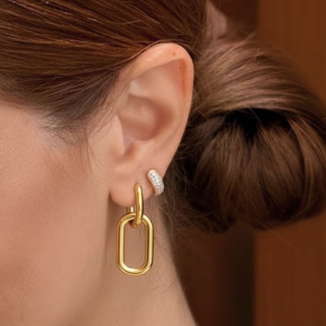 Composto por dois elos ovais em um design pendente, este par traz volume e um toque super moderno para a sua produção. A peça perfeita para quem gosta de um visual impactante e cheio de personalidade.