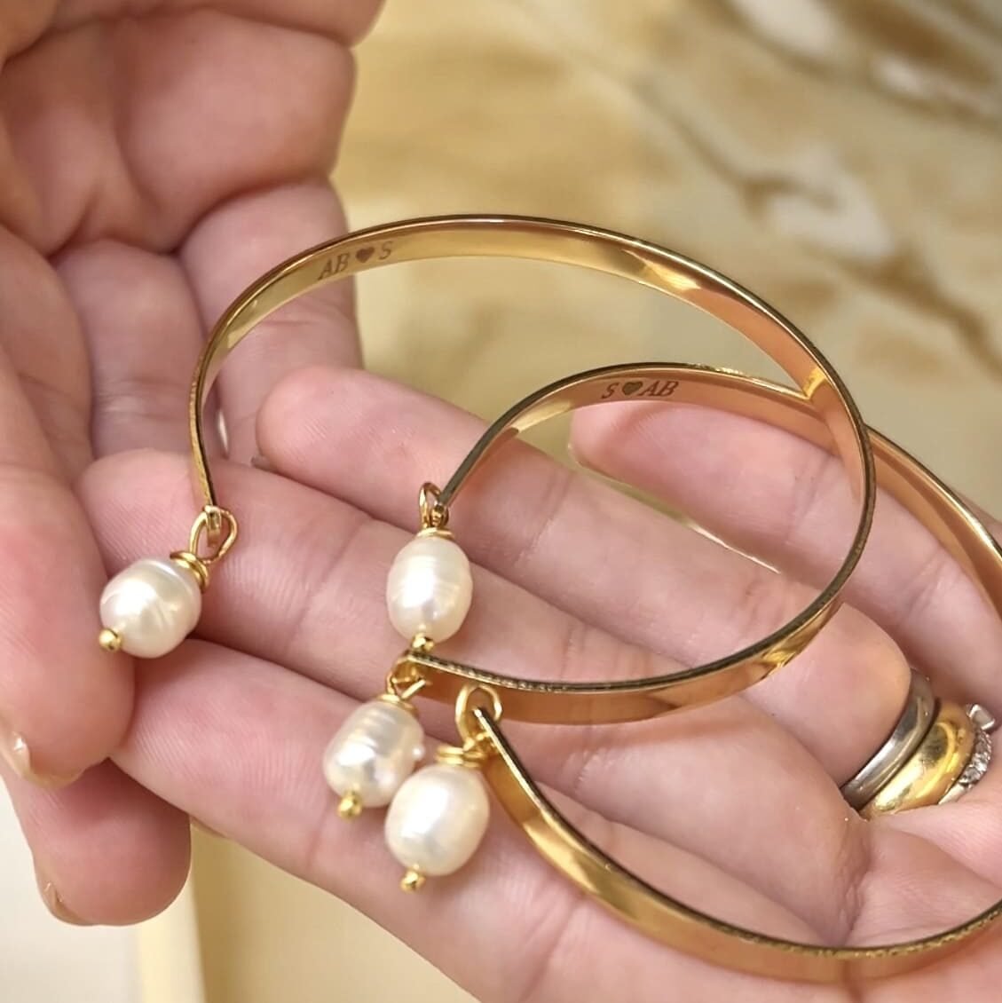 Bracelete Personalizado à laser com duas pérolas de água doce no fechamento (caso prefira, retiramos as pérolas). A personalização pode ser tanto internamente quanto externamente.