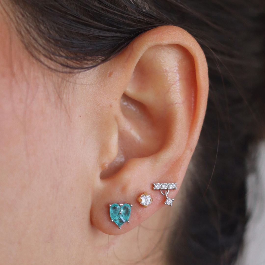 Este brinco delicado em prata apresenta um coração em tom verde, criando um visual fresco e romântico.