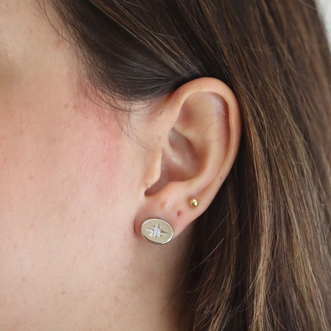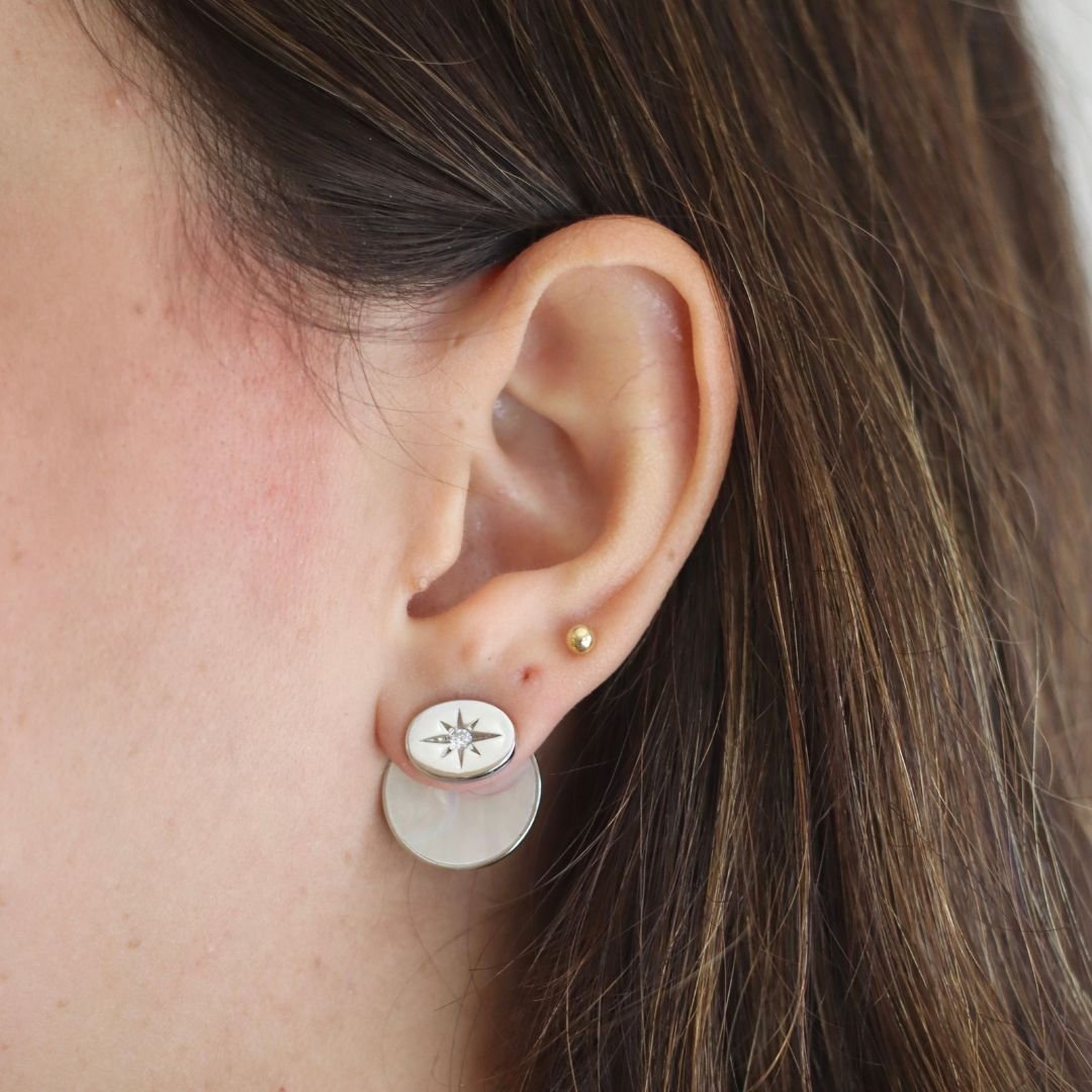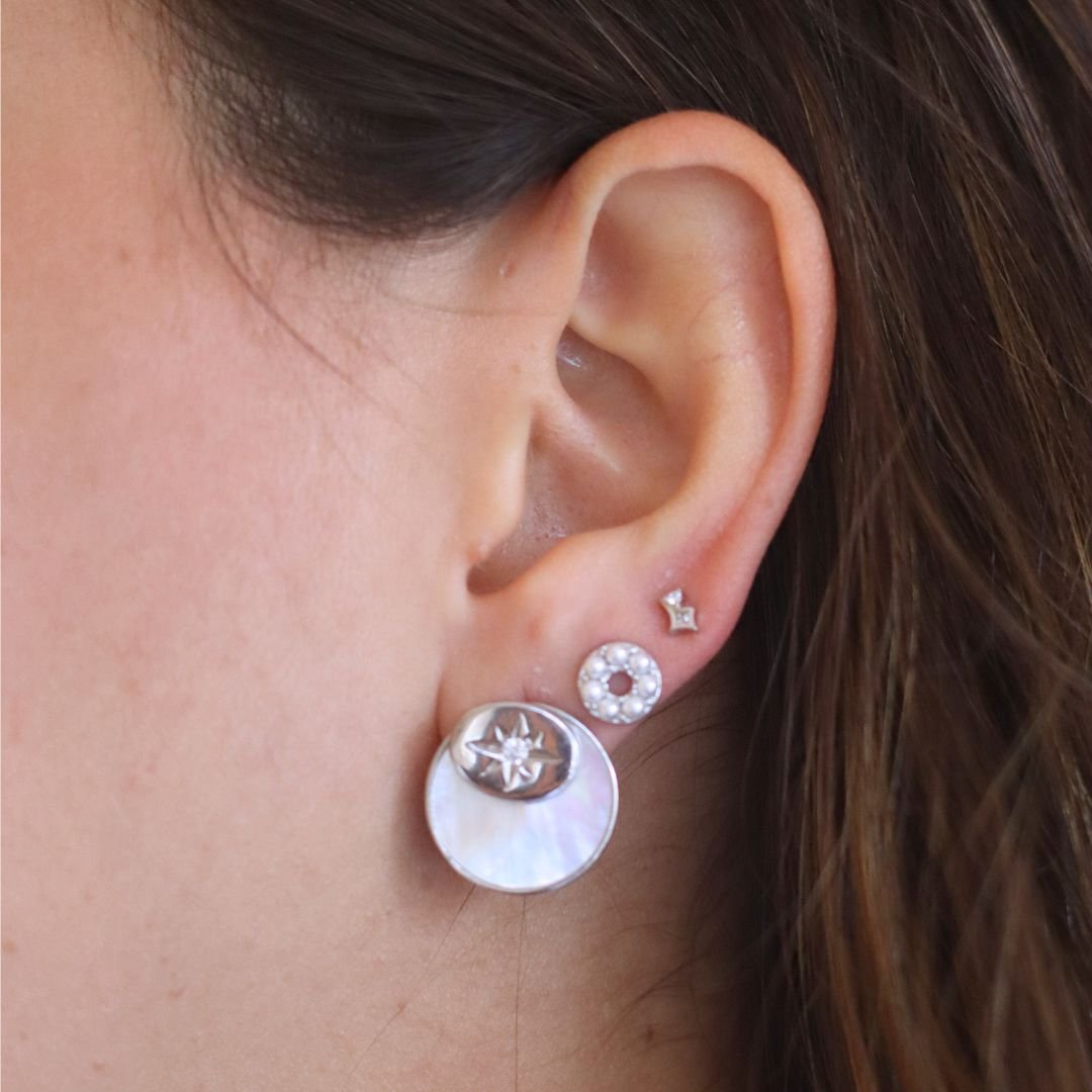 Brinco no modelo earjacket com madrepérolas e pedra branca cravejada. Um shape moderno, que permite a utilização e encaixe da joia de 4 formas diferentes, com um toque clássico trazido pelas madrepérolas.