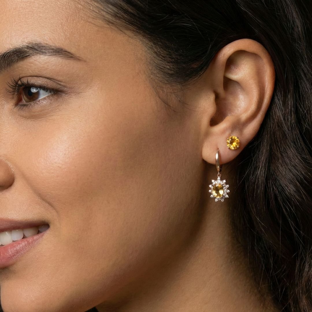 Combinando o tom vibrante do Citrino com o brilho incomparável da Moissanite, eles foram desenhados para iluminar o rosto e elevar qualquer produção.