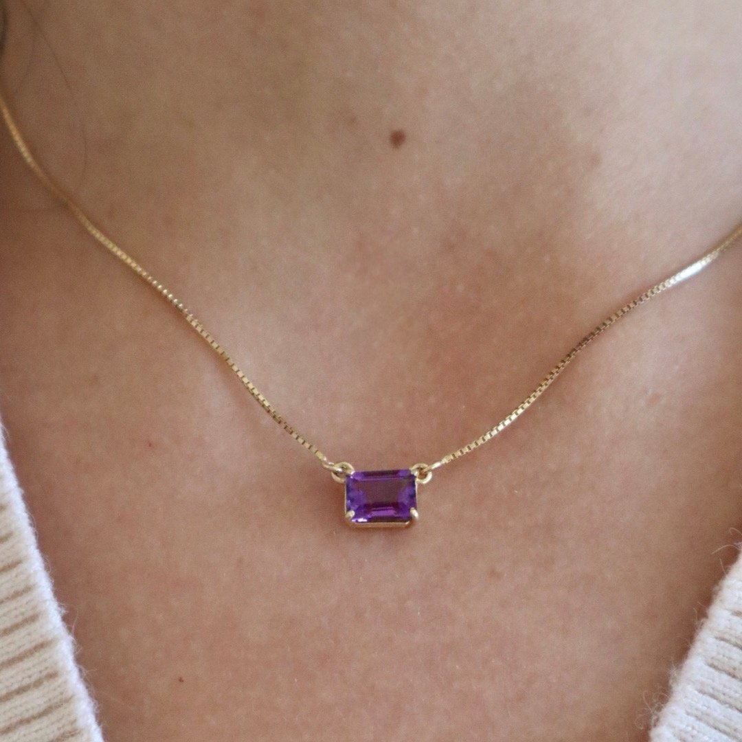 Um toque de cor e significado para o seu dia a dia. Este delicado colar traz uma pedra de ametista natural com lapidação retangular, montada em base de prata 925 com banho de ouro 18k.