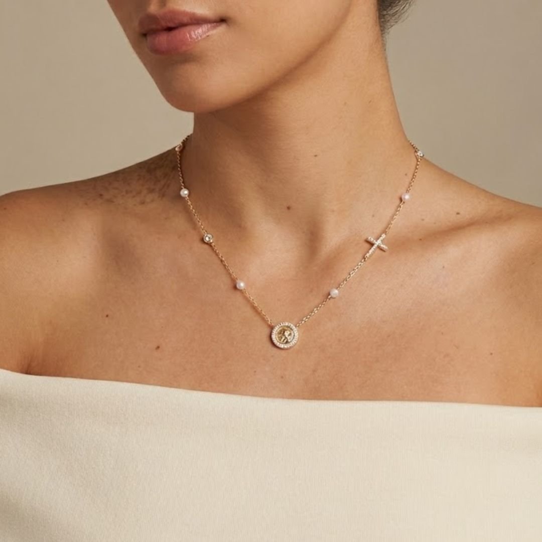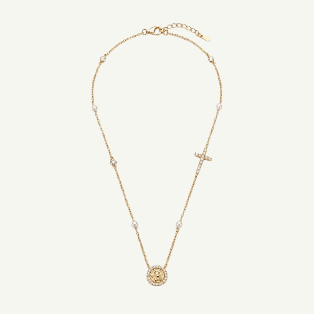 Além de levar sua fé, é uma joia que complementa perfeitamente os looks para o dia a dia, pelos cristais e pérolas.