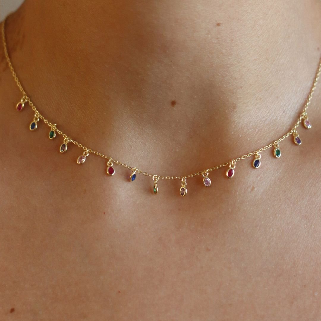 O design desta gargantilha aposta na tendência rainbow de forma sutil e elegante.