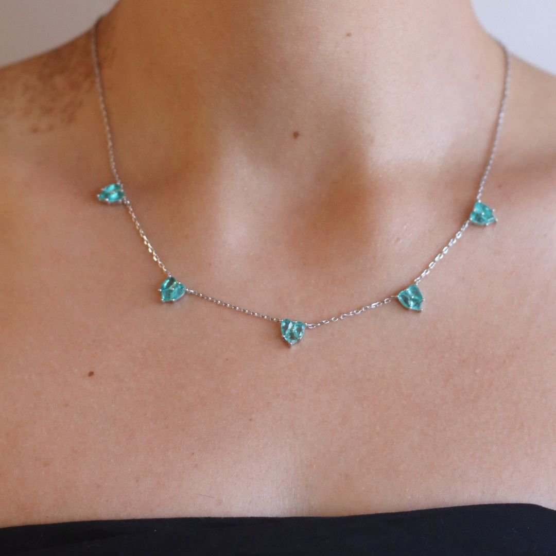Este colar delicado em prata apresenta uma sequência de corações em tom verde, criando um visual fresco e romântico.