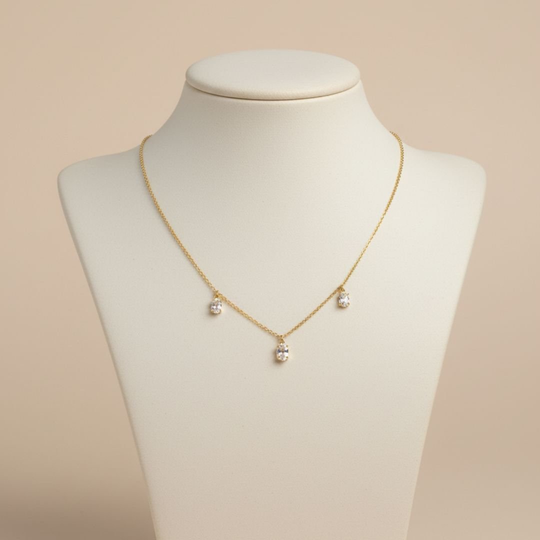 Colar minimalista com corrente em prata 925 e banho espesso de ouro 18, com três pingentes de Topázio Branco. Uma peça atemporal que complementa seus looks e pode ser usado para sobreposição.