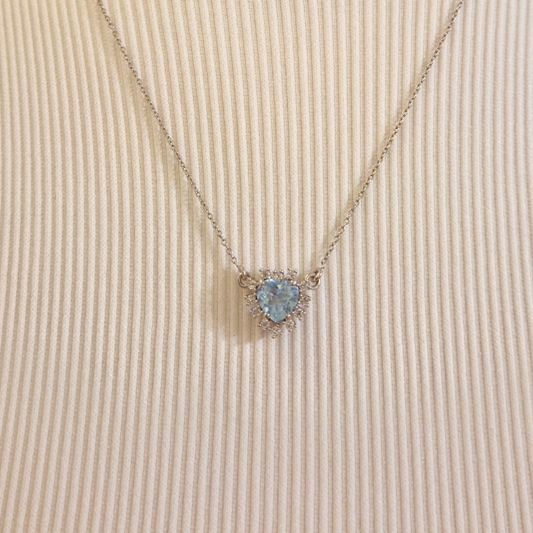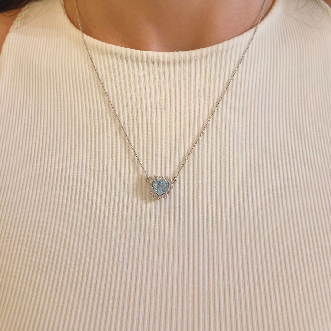 Este colar traz a delicadeza de um coração no tom azul suave do Topázio Azul, abraçado por um brilho clássico que ilumina o rosto.