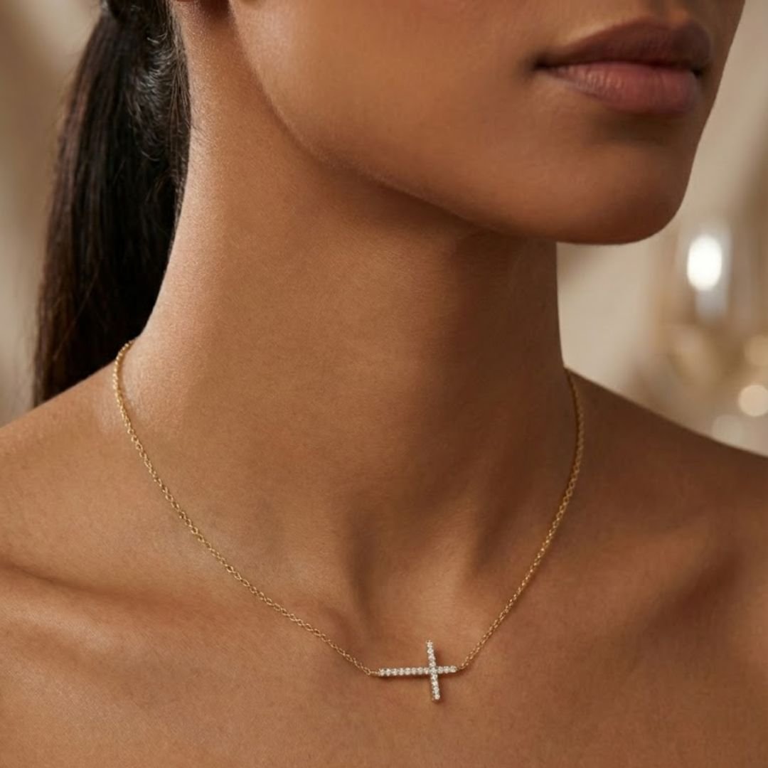 O detalhe da cruz deitada com zircônias garante um brilho sofisticado sem ser exagerado. Possui 45cm, ficando posicionado de forma ideal no colo.