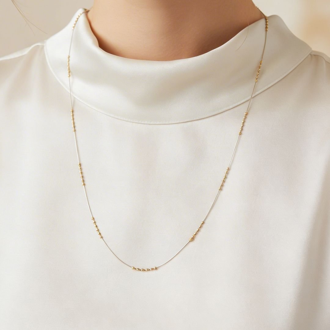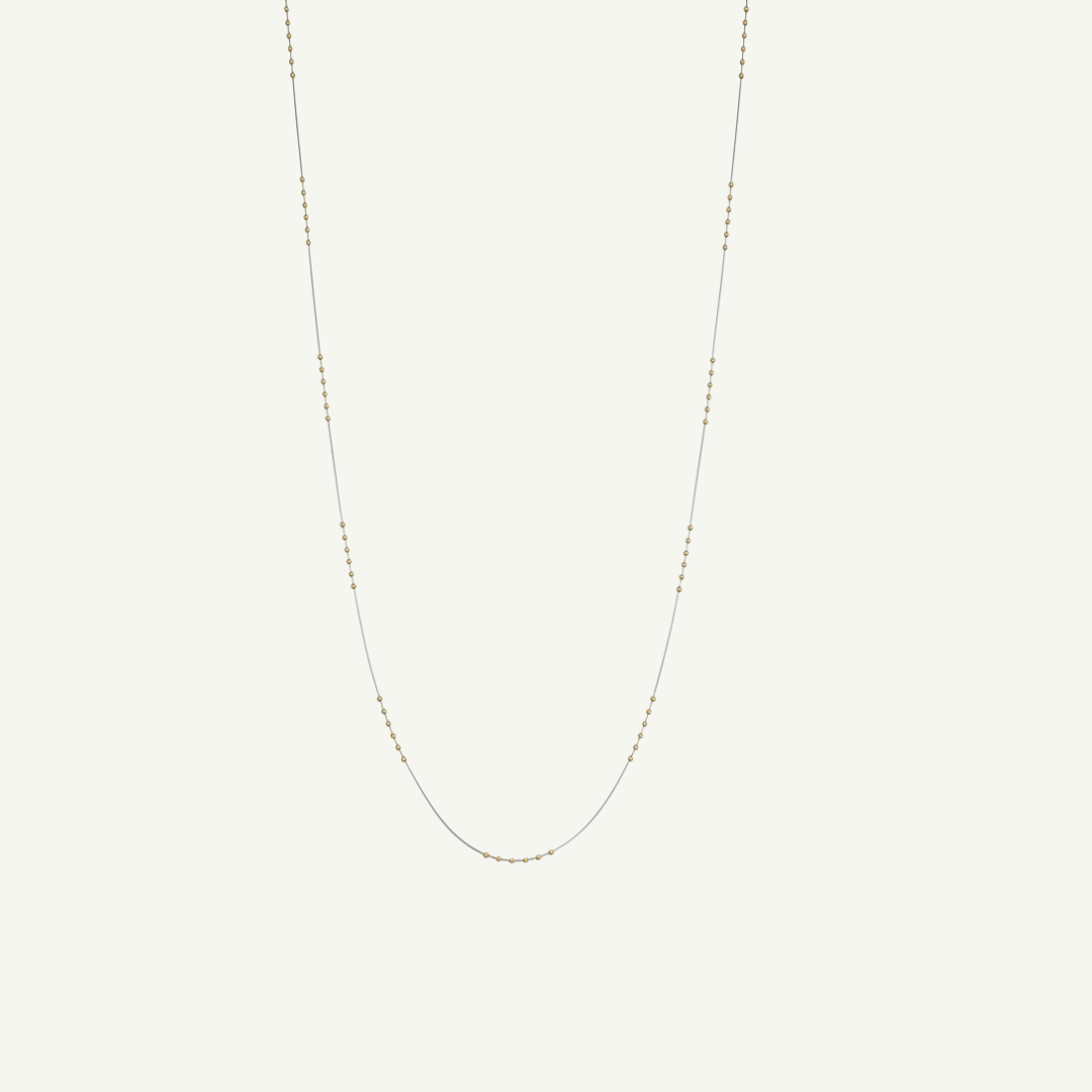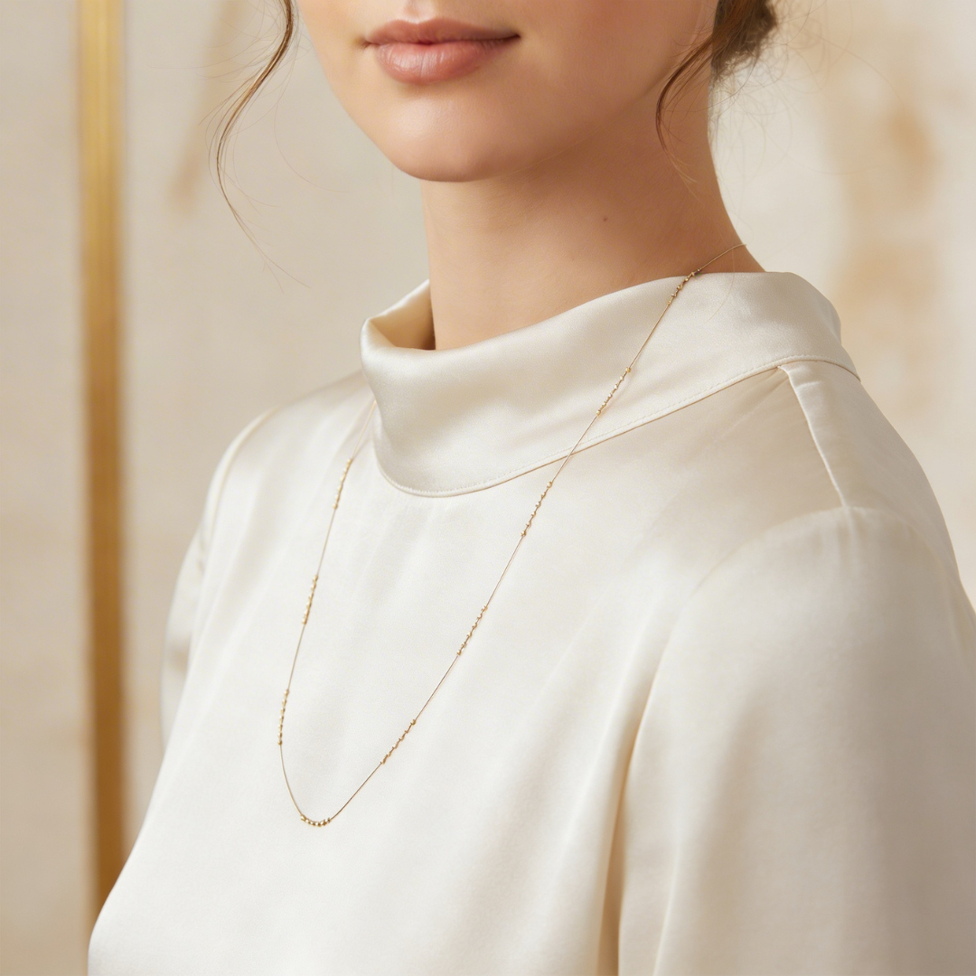 Existem joias que não precisam de muito para dizer a que vieram. Este colar longo, com sua corrente ultrafina e bolinhas douradas, é a definição de elegância sem esforço.