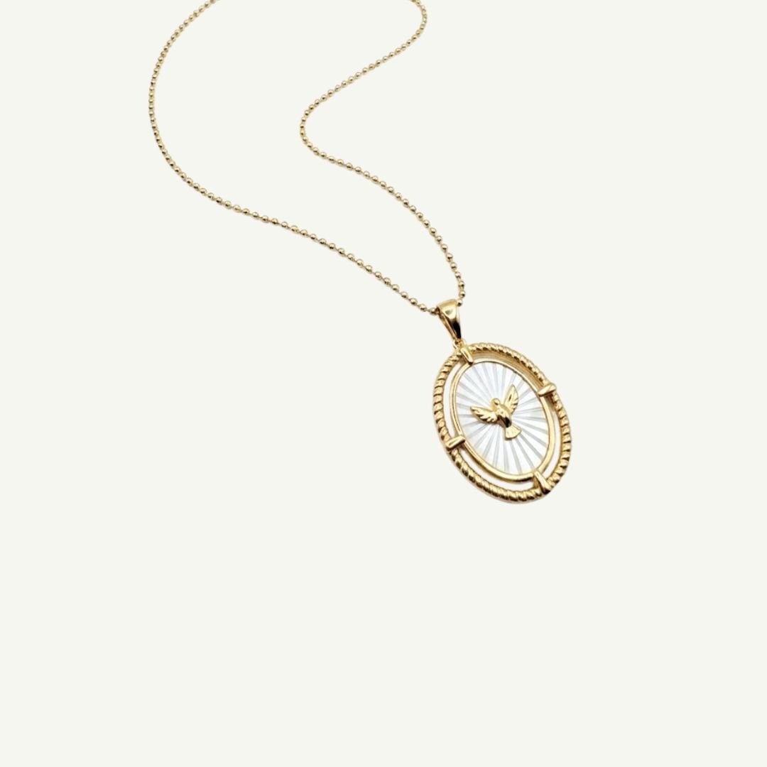 O pingente tem uma moldura de contas finas e um centro de madrepérola com um Espírito Santo. O pingente é suspenso por uma elegante e distinta corrente de bolinhas, completando a estética refinada da peça.