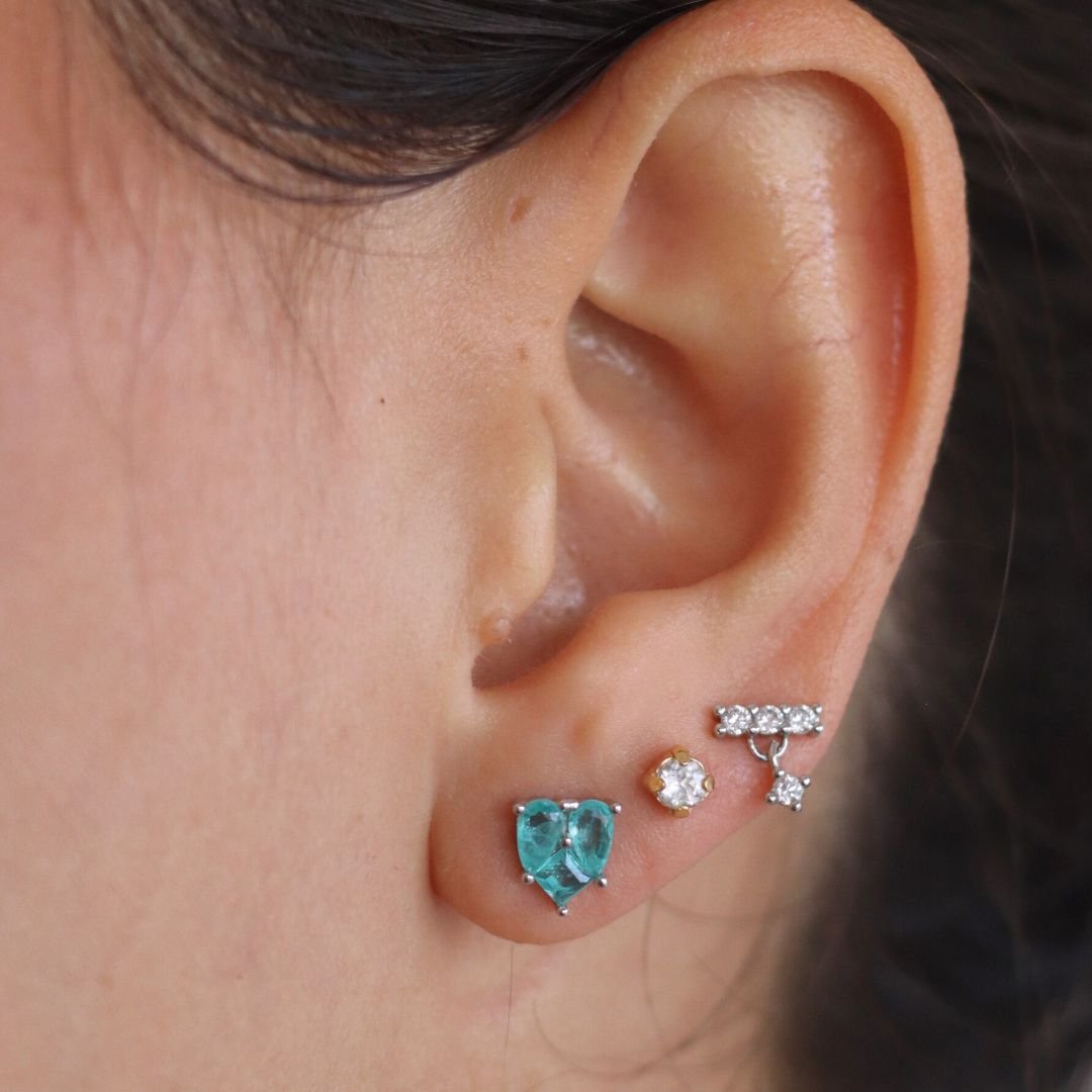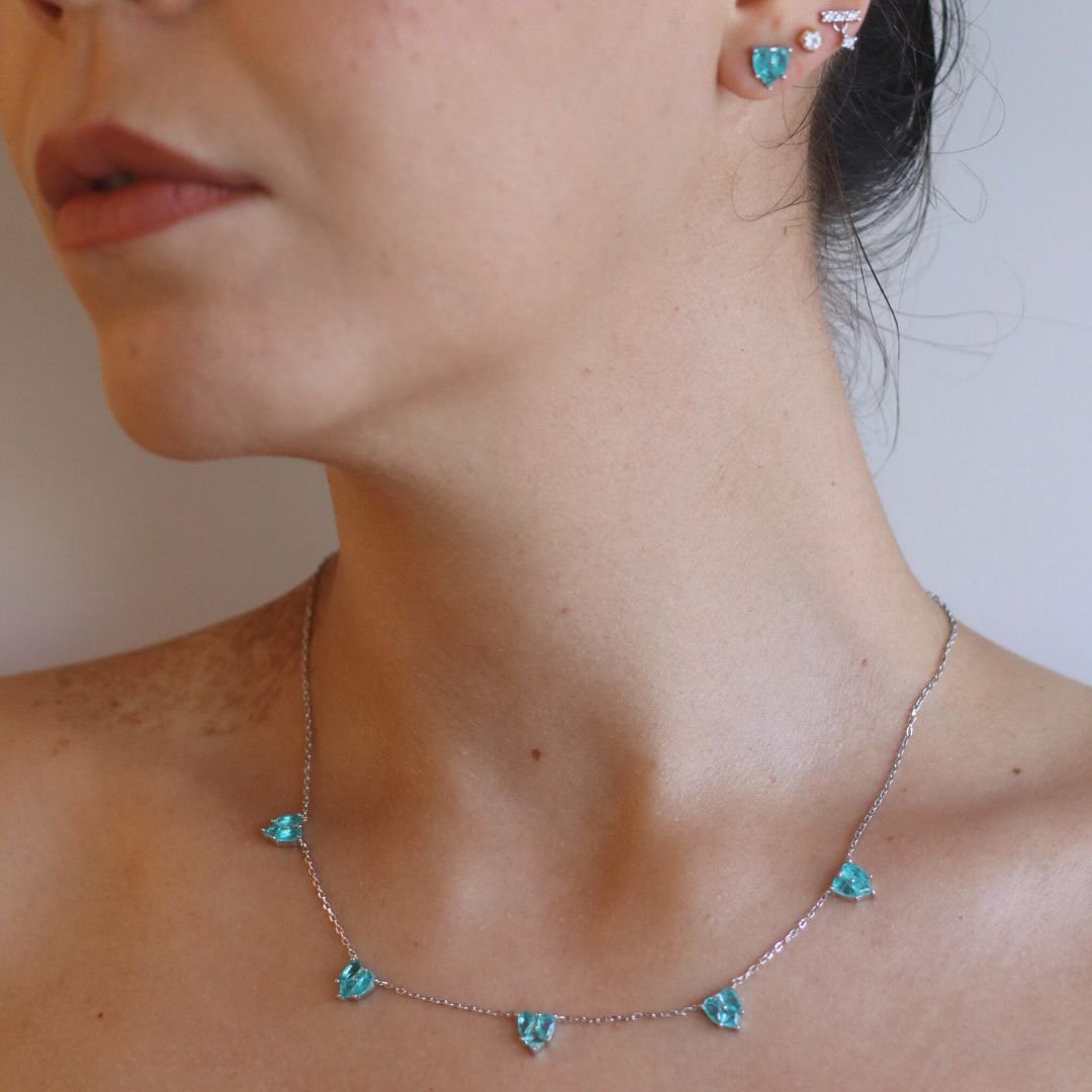 Este cojunto delicado em prata apresenta uma sequência de corações em tom verde, criando um visual fresco e romântico.