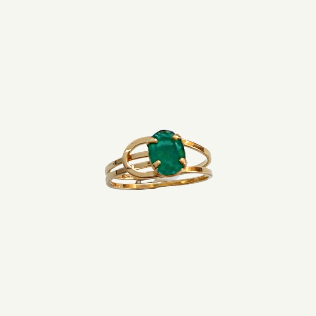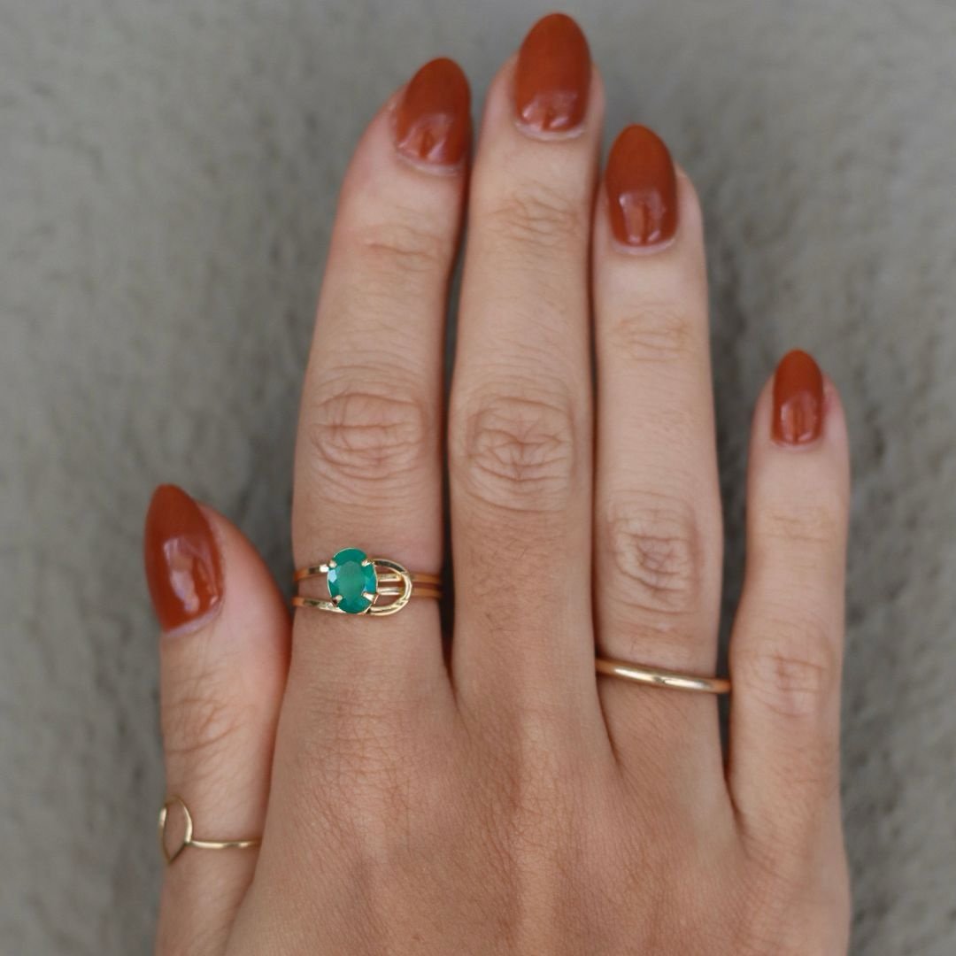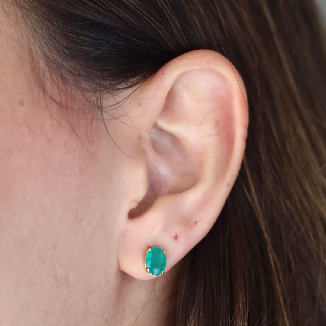O anel possui design regulável possibilitando seu uso em diversos dedos e estrutura delicada. Os brincos acompanham a lapidação da pedra do anel, formando um sofisticado conjunto em pedras preciosas brasileiras.