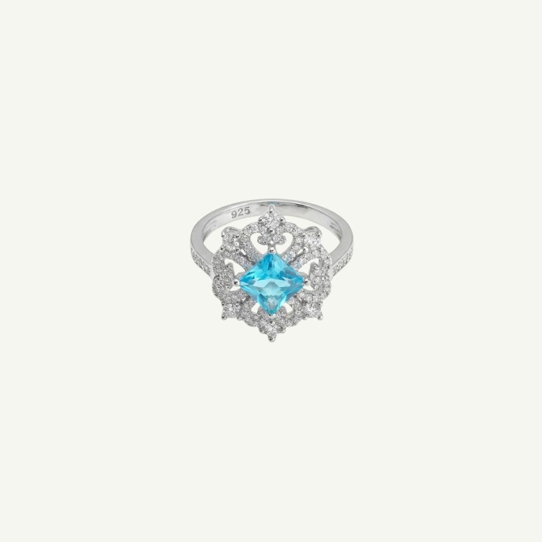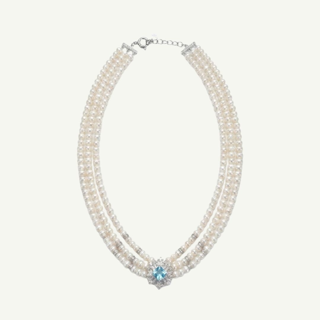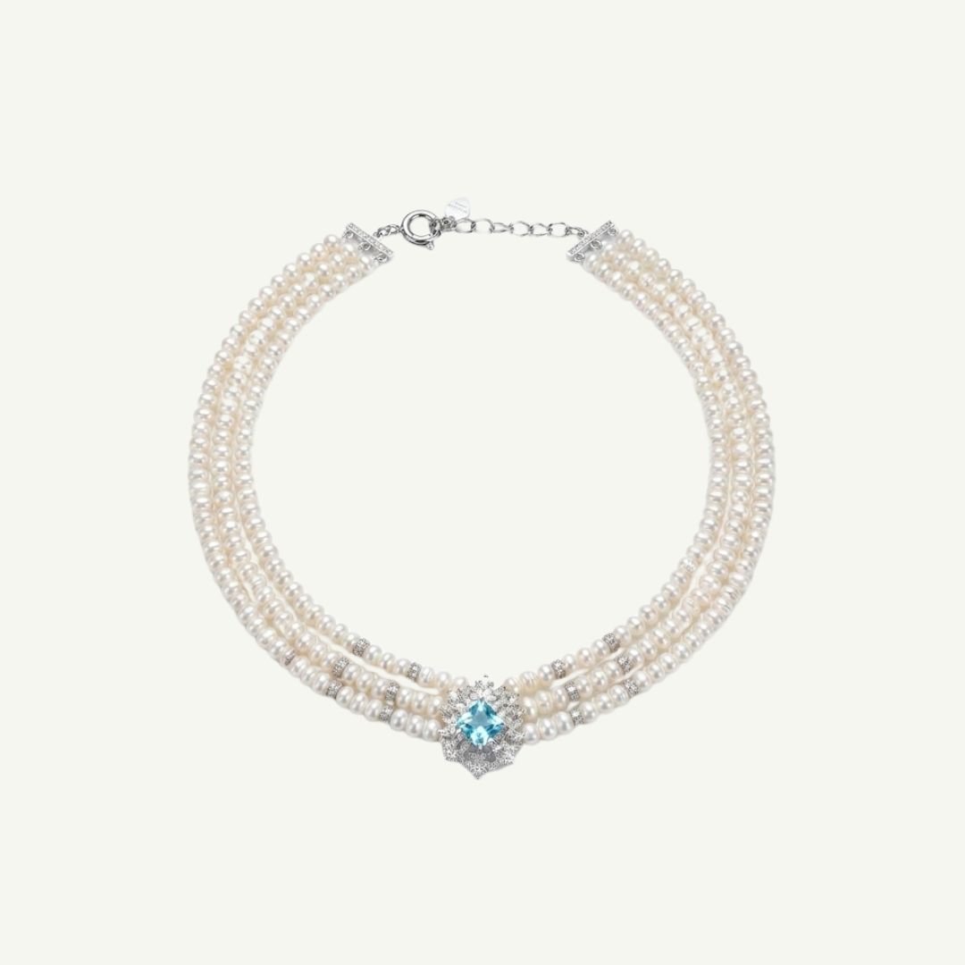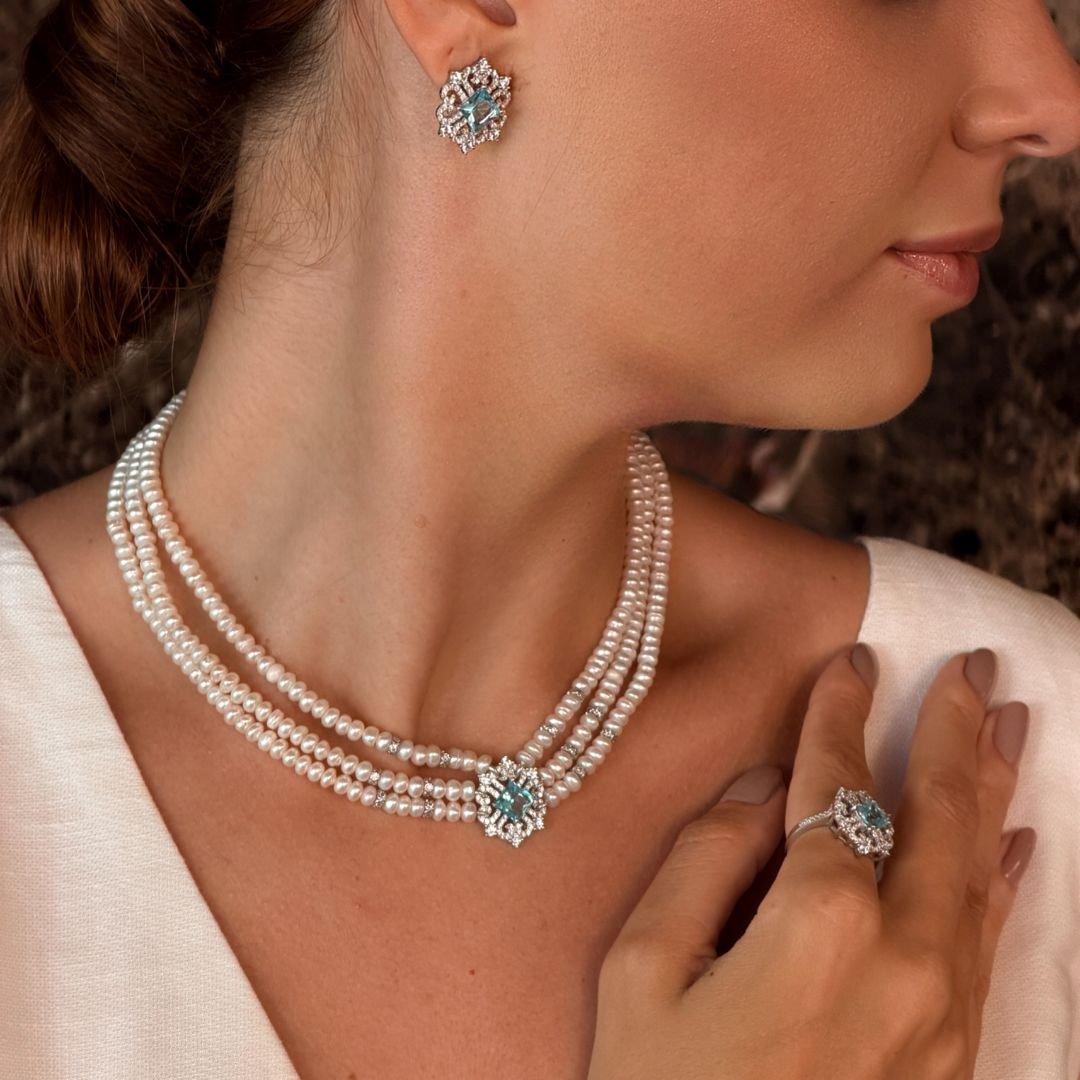 Unindo a gargantilha de pérolas, os brincos e o anel, criamos uma harmonia visual digna da realeza. O design floral com a pedra azul central se repete em cada peça, garantindo uma produção impecável e sofisticada do início ao fim.
