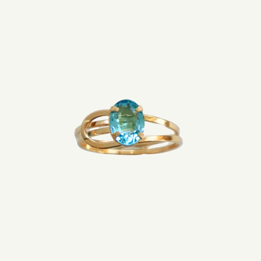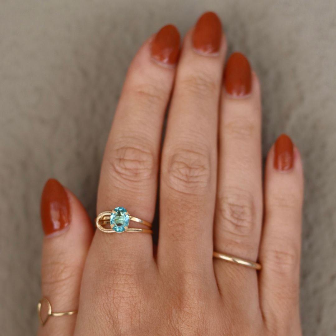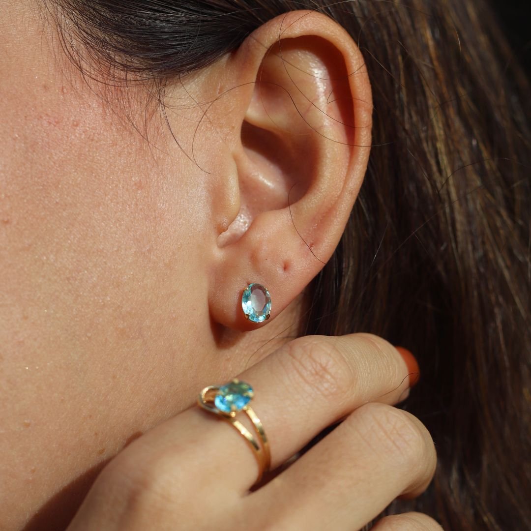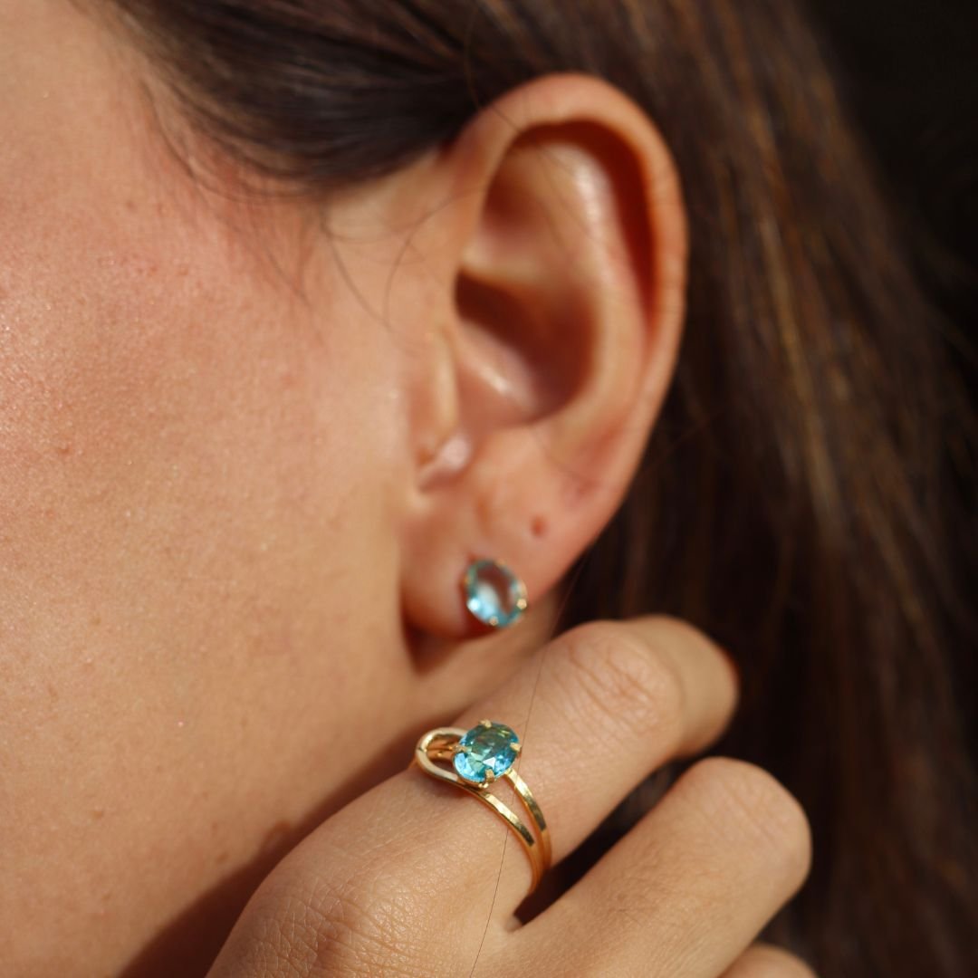 O anel possui design regulável possibilitando seu uso em diversos dedos e estrutura delicada. Os brincos acompanham a lapidação da pedra do anel, formando um sofisticado conjunto em pedras preciosas brasileiras.