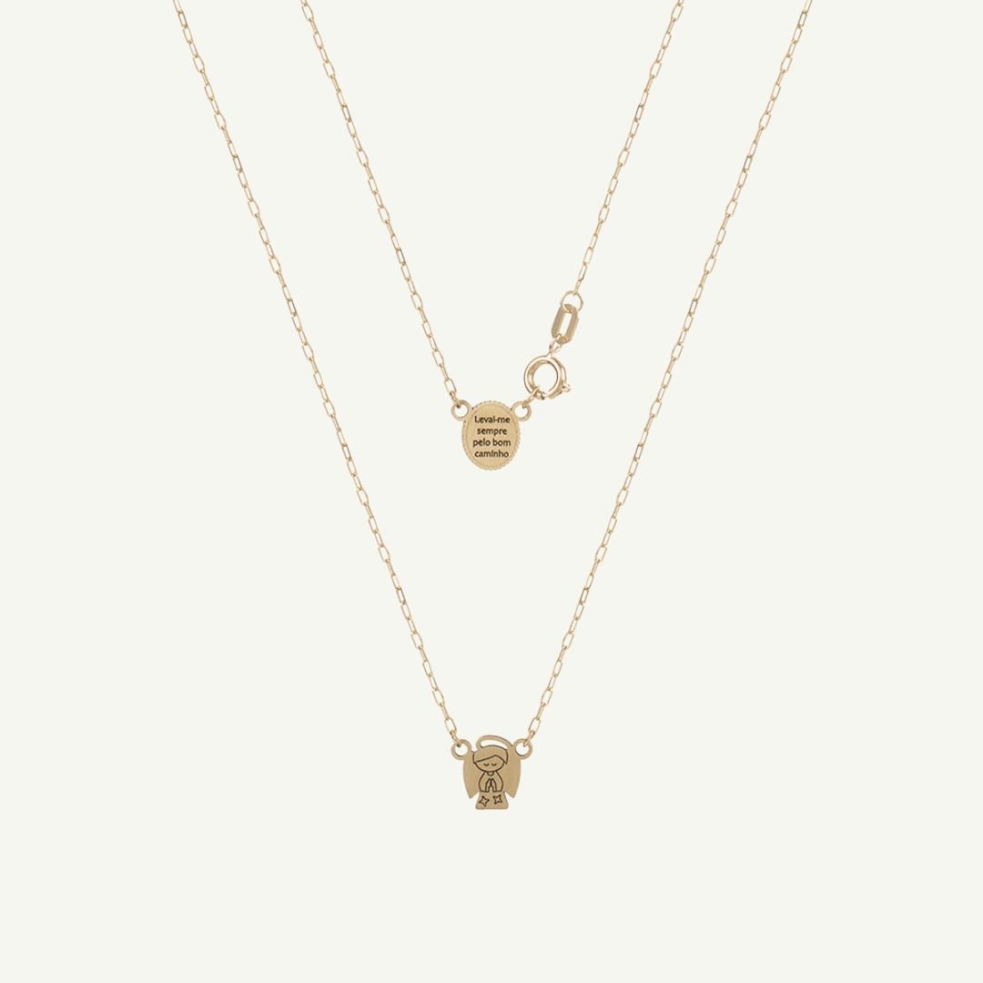 Com um design minimalista e traços suaves, a peça apresenta o contraste entre a silhueta de um anjo da guarda e a medalha com gravação personalizada “Levai-me sempre pelo bom caminho”.