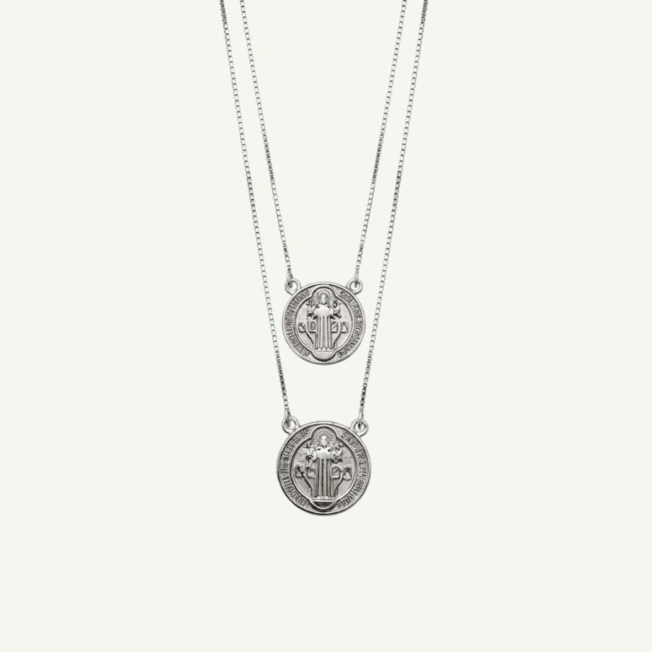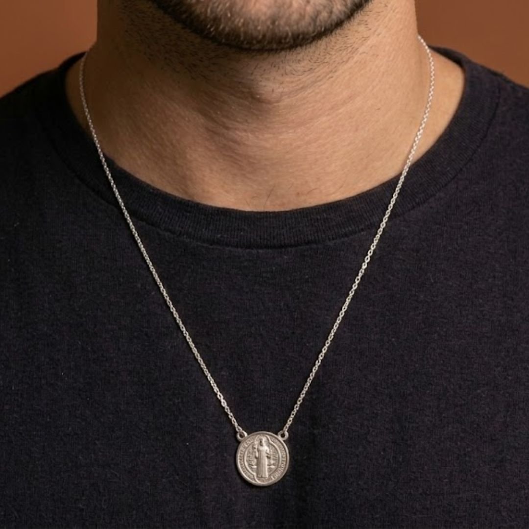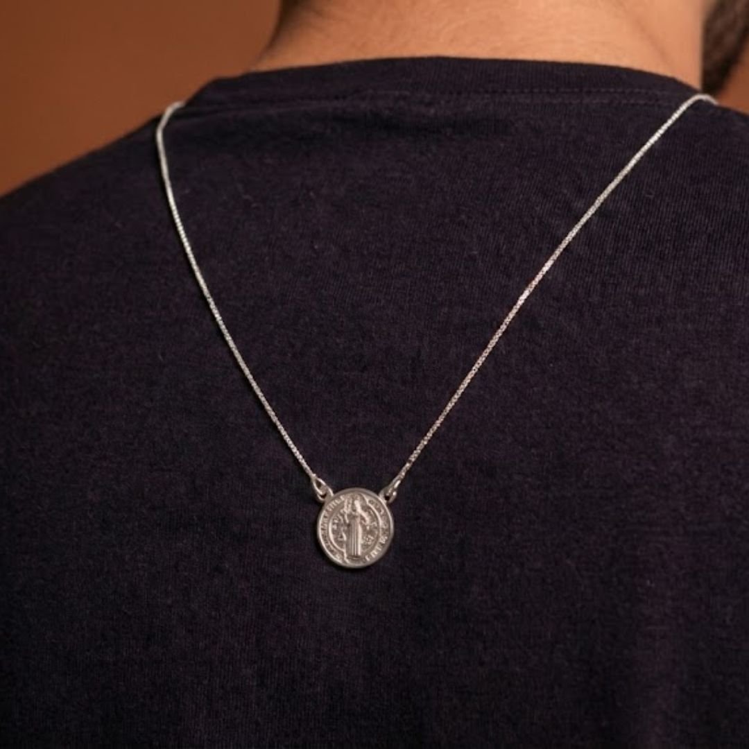 O escapulário de São Bento é feito em prata 925 com banho espesso de ródio branco e traz, em alto-relevo, um dos símbolos mais antigos e poderosos de proteção espiritual.