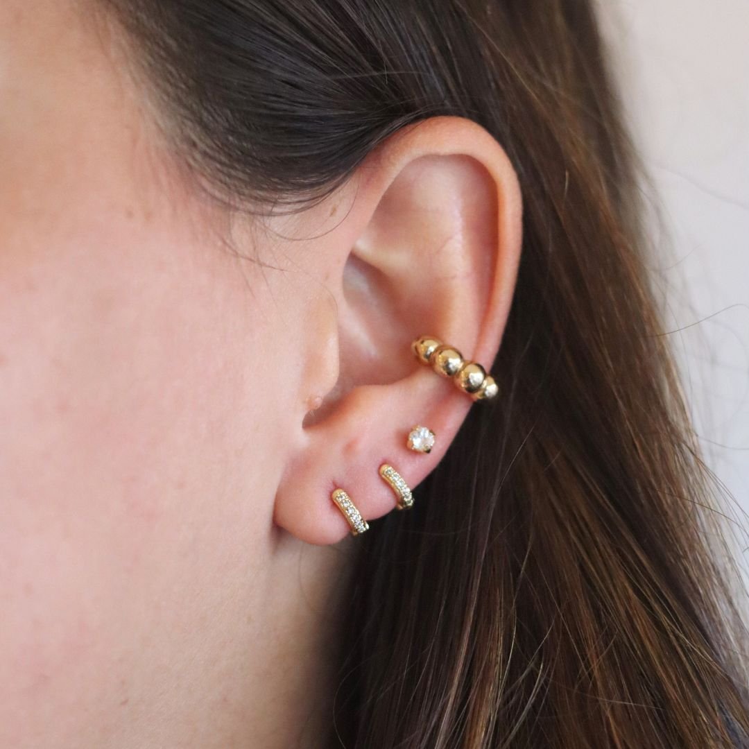 Fake piercing de pérolas em prata 925 com banho espesso de 10 milésimos de ouro 18k. Adaptável ao tamanho da sua orelha e super confortável.