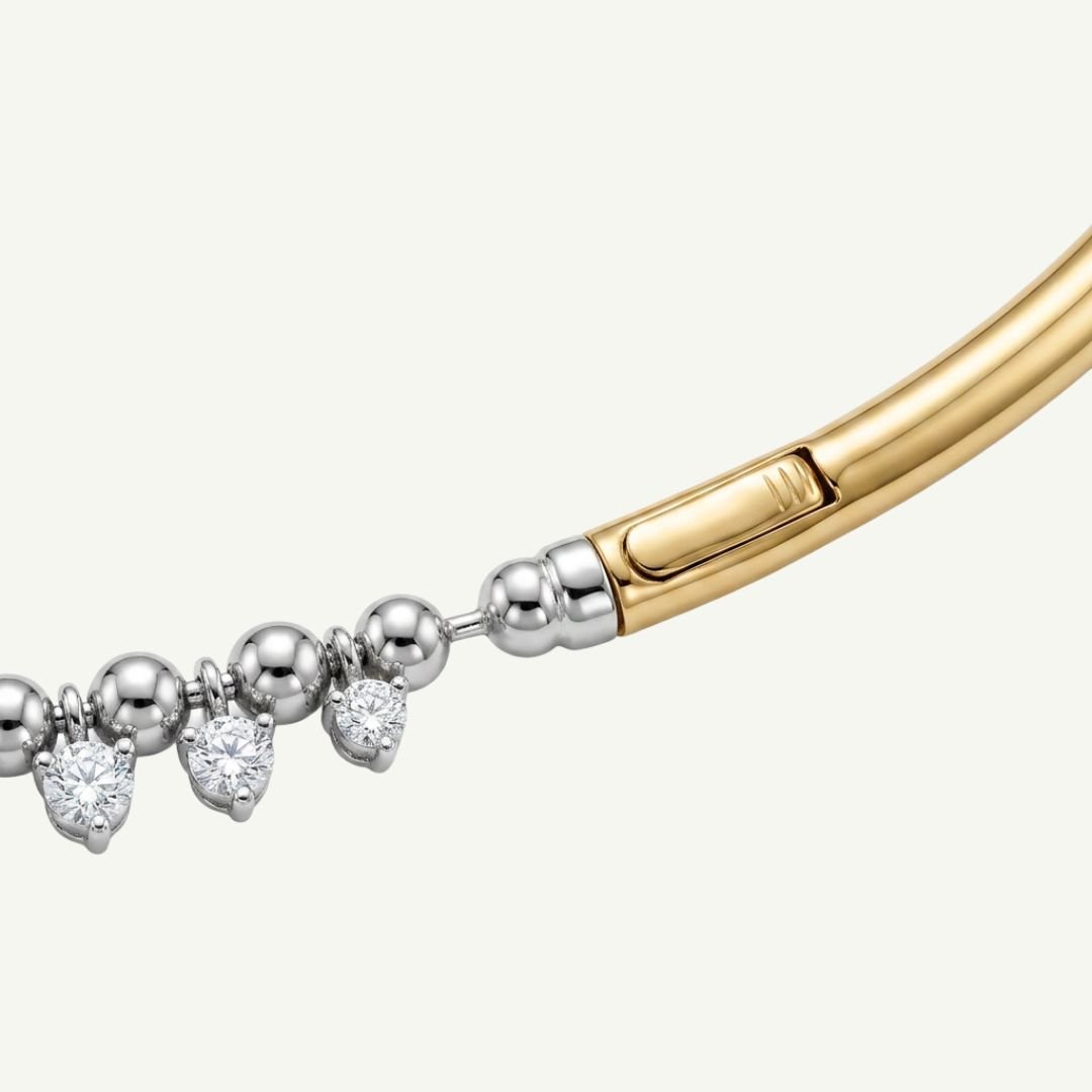Ela une a sofisticação de uma estrutura rígida, em prata 925 com banho espesso de ouro 18k, ao movimento das esferas e zircônias presentes. Uma joia que redefine o luxo contemporâneo, onde a leveza do design minimalista encontra o brilho eterno de pedras meticulosamente cravejadas, criando um contraste irresistível que flui graciosamente com você.