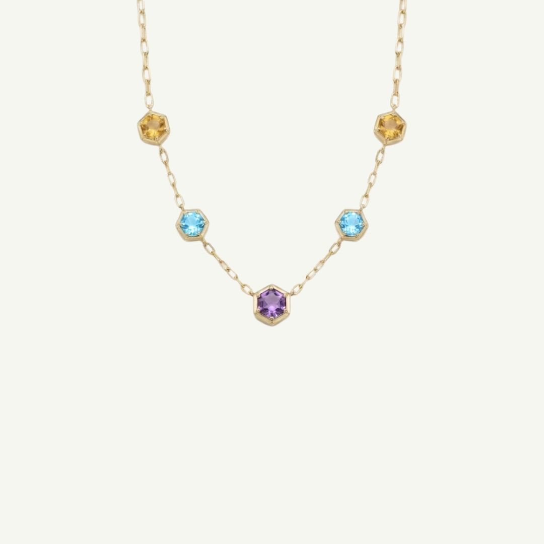 Com as gemas Ametista, Citrino e Topázio Azul, esta gargantilha une o clássico ao moderno. Perfeita para ser usada sozinha como destaque ou em camadas para uma produção mais elaborada.