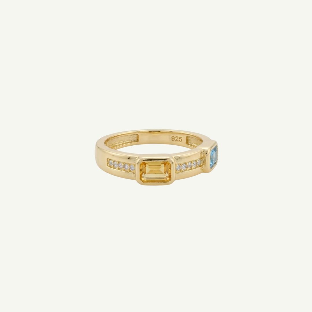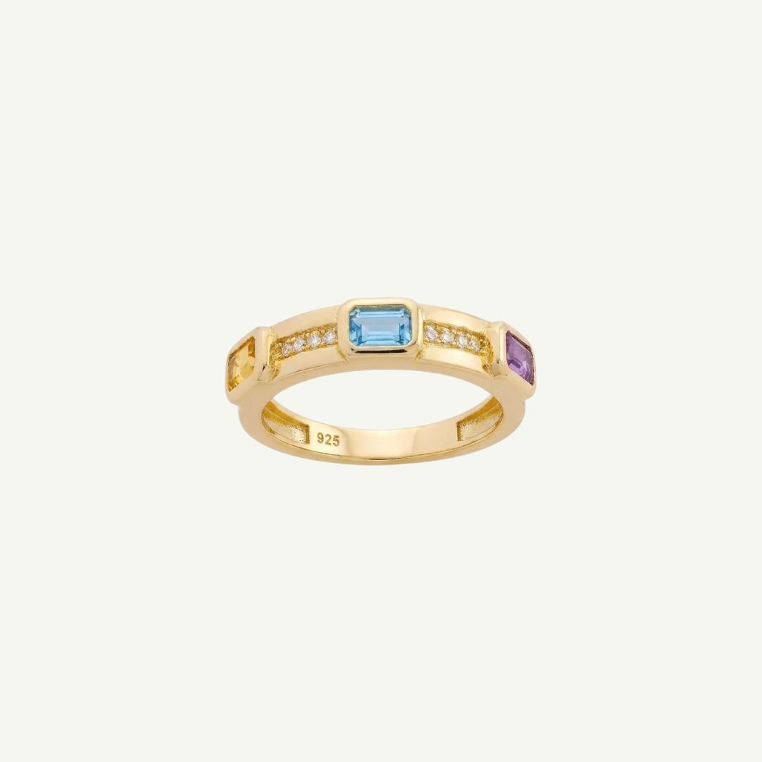 Meia aliança cravejada com Topázio Azul, Ametista, Citrino e cristais.