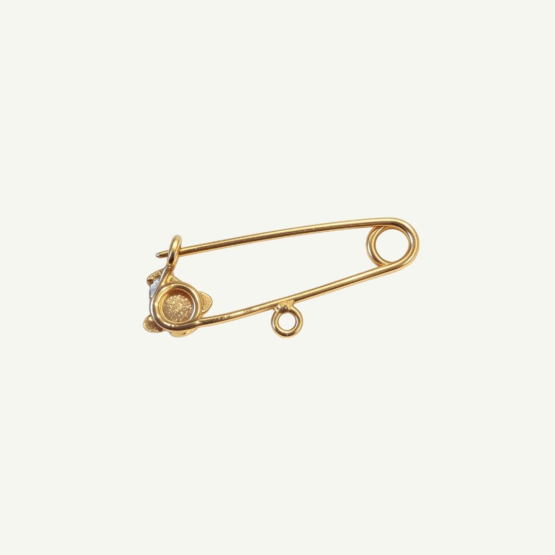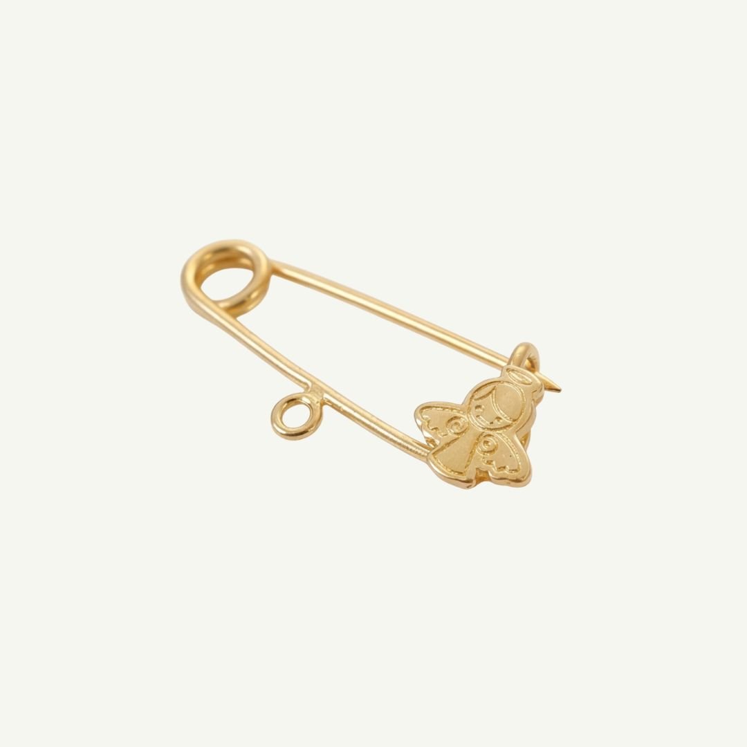 O alfinete clássico é elevado por um pequeno e delicado pingente de anjo dourado na cabeça de fecho, trazendo um símbolo de cuidado e espiritualidade.