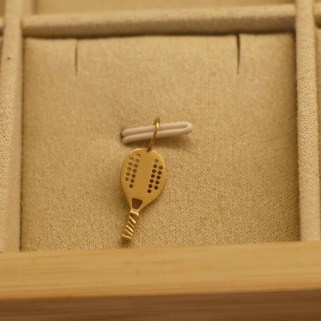 Nosso pingente Beach Tennis é perfeito para você que ama e pratica o esporte. Confeccionado em ouro 18k, o design delicado reproduz a forma da raquete com detalhes vazados na face, e um cabo texturizado. É a joia ideal para celebrar a paixão pelo esporte com sofisticação.
